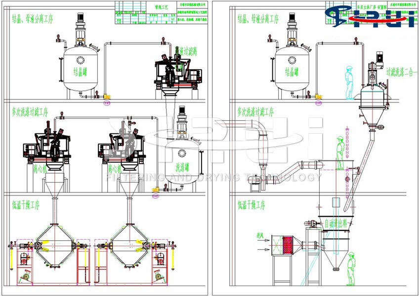 原料藥、農(nóng)藥、染料及其它精細(xì)化工生產(chǎn)過程的后處理工序中,一般要有結(jié)晶釜、過濾機、干燥機等設(shè)備來完成。這些設(shè)備單獨運作,都有各自的配套裝置,占地面積大,造價貴,單元與單元間物料的搬運或輸送較麻煩。不但勞動強度大,還易造成物料的流失浪費,生產(chǎn)周期長、能耗大、效率低影響產(chǎn)品質(zhì)量。